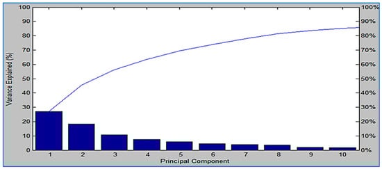 As part of the Compass software of the MBT, the PCA was applied as a data analysis tool to show the degree of similarity and diversity in protein profile spectra. Numerous algebraic evaluations have shown that PCA also reduces the complicity of a database’s variability. Figure 3 shows that three-dimensional (3D) PCA identified a number of spectrum proteins for isolates of MSSA and MRSA. The spectrums were represented with dots, and there is a precise representation of each spectrum in the color scheme. The difference between the spectrums is shown by how each dot represents a different spectrum when viewed from the protein side. The PCA calculation set has a high probability of producing loading values generated by the PCs. There was considerable distinction between the samples from the pre-established groups due to PC1, PC2, and PC3. These principle components were also useful in displaying dimensional relationships between samples. Since PCA provided loading values, it was simple to select the contributing peaks for additional analysis. In order to calculate PCs, the variables (peaks) were loaded differently depending on how much variance they explained in the PC. Based on the calculation of PC1, PC2, and PC3, we identified each signal with loading 1, loading 2, and loading 3 values. The loading values ranged from −1 to 1, depending on their contribution to the explained variance of a PC. For S. aureus, it was estimated that the influences of the three principal components of the PC model (PC1, PC2, and PC3) were approximately 26%, 17%, and 12%, respectively, in the proportion of explained variance (Figure 4).