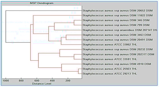 In less than two minutes, using the peptide mass fingerprinting method, the isolates of Staphylococcus species achieved higher scores (2.0) than conventional methods, indicating a number of advantages including a reduction in the duration of the test, making it less expensive, and an accuracy of >99% [,]. Other studies demonstrated the ability of MBT to successfully identify 95–100% of S. aureus isolates with elevated values [,,]. The analysis of data obtained from the current study with MBT revealed that the majority of the spectral peaks of the tested S. aureus strains fell within the range of 2000 to 15,000 Da. The range of results presented in this study is consistent with those reported in previous studies involving the use of MBT for microbe identification [,,]. Earlier investigations [,] showed that most spectral peaks fell within the range of 800 to 3500 Da, though this range was not fully reflected in the current study. This variation in mass and charge ranges of the spectral peaks may be attributed to changes in the sampling method preparation.