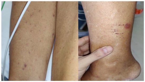 Case Report #1: A 67-year-old woman affected by dyslipidemia, carotid atheromasia, and osteoporosis was admitted to the infectious diseases ward in August 2022. The clinical history began the previous two weeks when she had high fever (up to 40 °C) and maculo-papular rash. Interestingly, two brothers showed the same clinical pictures. In fact, all these people were “at risk” of acquiring rickettsial infection because they lived together in the same house in the countryside, owned pets, worked in the garden, and shared the same bench located in the park where they usually were sitting. Therefore, she and her brothers came to the emergency room of another hospital in Catanzaro and a chest radiography was performed which showed signs of interstitial pneumonia. Blood tests showed relative neutrophilia without leukocytosis and a C-reactive protein of 16.0 mg/L.
