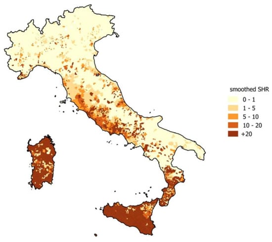 As shown in Figure 2, four regions of Italy (Sardinia, Sicily, Calabria, and Lazio) have higher morbidity rates than the Italian average (11.9, 10, 4.7, and 3.9, respectively) [15].
