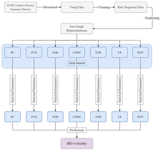 In this study, we designed an ML system to detect IBD using genetic sequence data. Firstly, the sequence dataset was downloaded from an open access NCBI database. The fastq files were cleaned to obtain raw sequence files. These files contain thousands of raw genetic sequences. In the third stage, these sequence reads were converted to the k-mer based structured graph representation form. In the next stage, this structured dataset was divided into train and test subsets. The Grid Search algorithm was used to optimize the hyperparameters of the ML models. Then, ML models with optimized hyperparameters were trained with a train subset of the dataset. Finally, the test subset was used to measure the performance of the ML models.