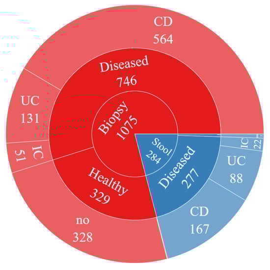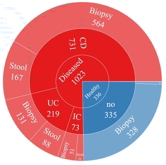 Figure 2. Accordingly, 1075 (79%) of 1359 samples in the dataset were obtained by biopsy and 284 (21%) were obtained from stool samples. IBD was diagnosed in 746 (69%) of the people from whom biopsy samples were taken, while the remaining 329 (31%) did not have this disease. In addition, 277 (97.5%) of the participants whose stool samples were collected were diagnosed with IBD, while the number of those who did not have the disease was limited to 7 (2.5%).