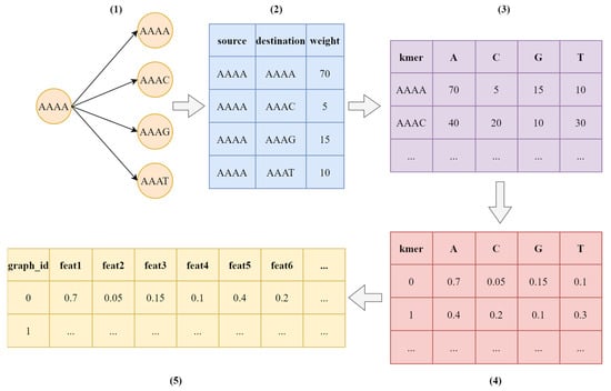 ML and DL models require structured files to be trained. For this purpose, the dataset has to be converted to standardized structure. We designed a novel way to represent sequence files in De Bruijn graphs. Due to the nature of the De Bruijn graph, there is only one character change between its two edges. It is also worth remembering that there are only 4 different characters in a sequence. Hence, there are only 4 different nodes to go after each edge, and the last character added in these nodes can be one of the 4 bases (A, C, G, T). Therefore, a structure with all possible nodes and 4 bases to represent the next node can be used for training ML and DL models. This structure of the dataset can be seen in (3) and (4) of