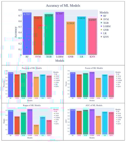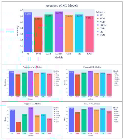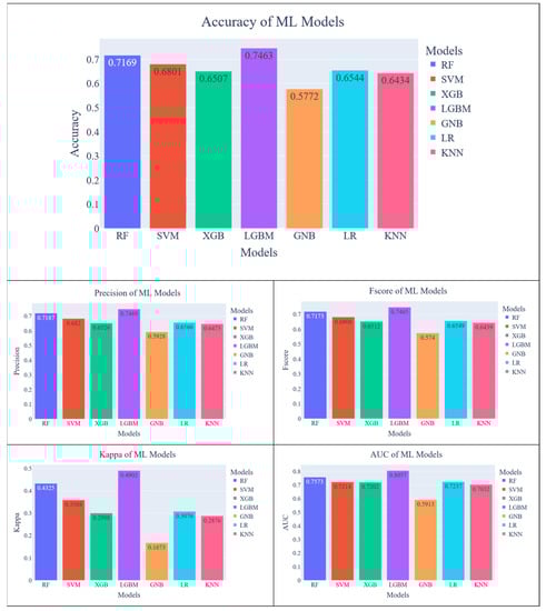 Figure 7. Regarding accuracy, the most successful result was obtained from the LightGBM model with 67%, followed by RF model with 65%. These two models outperformed others in each metric. Also, the AUC score of these two models is quite close. While the difference between the success of the models in accuracy, precision and fscore metrics is small, the difference is more clearly seen in the Kappa metric. On the other hand, the least successful result was obtained from the SVM model with 57% which also shows worst performance regarding other metrics.