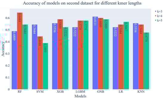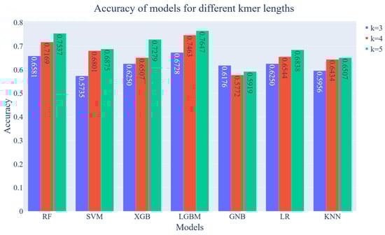 Figure 10). While the LightGBM model outperformed other models for each k-mer length with over 76% accuracy, RF, also provided similar results. As the k-mer length was increased, the performance of XGBoost also showed a significant increase, reaching above 72% accuracy.