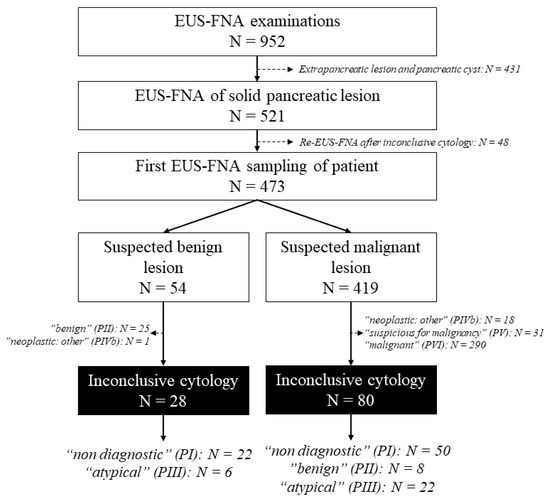 This is a retrospective, single-center cohort study which was carried out in one of the Hungarian tertiary-level referral gastroenterology centers in cooperation with the pathology department. The MedSolution hospital information system was used to collect the medical documentation of patients. All consecutive patients were enrolled between January 2014 and December 2021 who underwent EUS-FNA sampling for solid pancreatic lesions. The patients were divided into two subgroups based on the diagnostic value of the obtained EUS-FNA samples: subgroups of conclusive and inconclusive cytology. We considered inconclusive those cytological results which did not help to establish a definitive diagnosis or to reliably differentiate between the benign or malignant origin of the lesion. For the objective definition of these cases, we used the Papanicolaou Society of Cytopathology System for Reporting Pancreaticobiliary Cytology (PSC system), which facilitates interpretation of the findings by providing information on the evaluability of the sample and the certainty of the malignant diagnosis [8]. All cytology cases classified in the “non-diagnostic” (I) and “atypical” (III) categories of the PSC system were included in the group of inconclusive cases, regardless of the nature (benign or malignant) of the solid pancreatic lesion suggested by the EUS image. Furthermore, selected cases of the “negative for malignancy” (II) category were also added to this group if malignancy was suspected based on the EUS image due to the necessity for further diagnostic steps for validation of the diagnosis. The “neoplastic: benign” (IVa), “neoplastic: other” (IVb), and “malignant” (VI) categories of the PSC system were classified into the conclusive cytology subgroup, as well as the “suspicious for malignancy” (V) category, due to its high risk of malignancy (ROM) in an appropriate clinical setting [9,10].