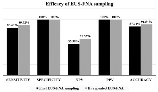 The diagnostic accuracy achieved in our study is consistent with the results published in international studies and high-quality meta-analyses, with a pooled sensitivity of 84–89% and a specificity of 96–99% [3,11,12]. However, the diagnostic efficacy of the method for solid nodules in chronic pancreatitis are significantly lower: sensitivity 65% (52.6–75.6%) and specificity 96.8% (75–99.7%), respectively [13]. Despite the convincing data, the NPV of EUS-FNA for suspected pancreatic tumors is considered low, and in our study it was also barely above 50%; furthermore, the inconclusive (atypical cells, suspicious for malignancy), negative for malignancy, or nondiagnostic results do not allow the definitive diagnosis of the benign conditions. In this situation, further cross-sectional imaging, another sampling, or even surgery may be necessary to shorten the diagnostic delay. Our data also show that repeated EUS-FNA sampling substantially increases the diagnostic accuracy of EUS-FNA from 87.74% to 91.54%. This is consistent with the meta-analysis published in 2020 by Lisotti et al. which also demonstrated that repeated EUS-FNA for the diagnosis of solid pancreatic masses in cases of a previous nondiagnostic or inconclusive result is an effective diagnostic tool, with 77% (66–86%) sensitivity, 98% (78–100%) specificity, 99% (98–100%) PPV, and 61% (60–63%) NPV [14]. The additive benefit of rapid onsite evaluation (ROSE) was also shown by a significant increase in sensitivity (85% vs. 65%) and a reduction in the number needed to diagnose (1.2 vs. 1.7). The need for ROSE is not yet discussed in detail in the ESGE guidelines, and there is conflicting evidence in the scientific literature [1,2,15,16,17,18]. However, recent studies have emphasized its benefits in terms of both diagnostic yield and cost-effectiveness [19,20,21]. Furthermore, a multicenter retrospective study by de Moura et al. concluded that FNB alone produces a similar diagnostic yield compared to EUS-FNA with ROSE. Therefore, FNB may be useful in cases where the results of previous EUS-guided sampling were indeterminate [22]. An alternative solution is the use of self-ROSE, where a specimen’s adequacy is immediately assessed by a trained endoscopist [23]. In our study, only EUS-FNA samplings were evaluated, excluding EUS-FNB samplings, but ROSE was not available, and we have no experience with the self-ROSE technique.