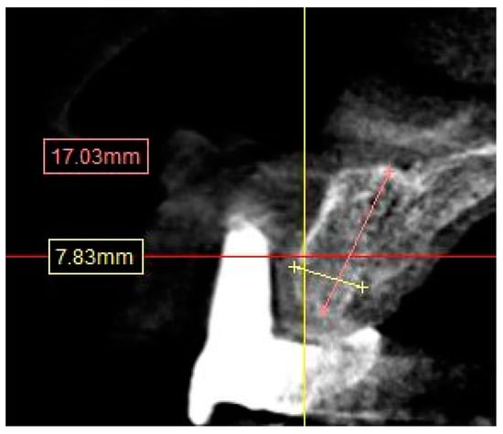 Figure 2. CBCT image showing measurement calculation for the distance from maxillary ridge crest to the floor of the sinus.- ∘