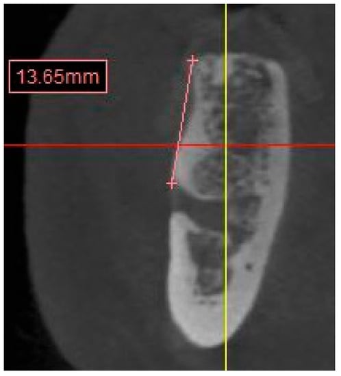 Figure 4. CBCT image showing the measurement calculation for the distance from mandibular ridge crest to the superior boarder of the inferior alveolar nerve canal.- ∘