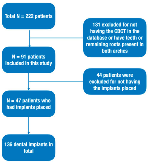 Another 44 patients were excluded because the implant procedure had not been carried out. Only 47 patients (55 arches) were included in the study to evaluate the predictability of predicting the implant through CBCT alone. (Figure 7).