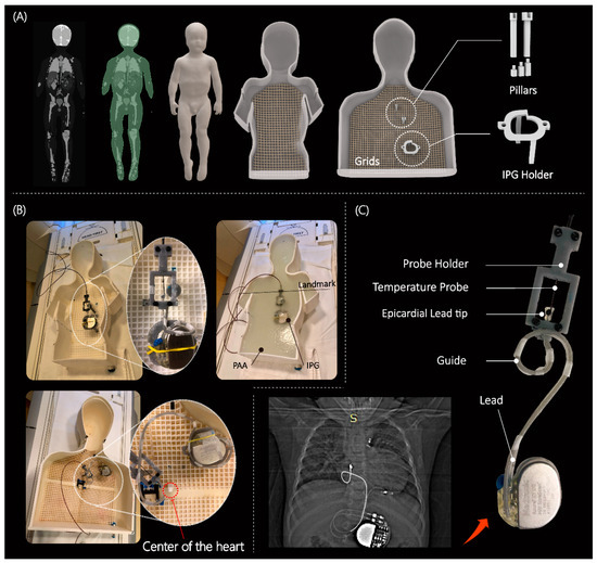 (A) 3D models of human-shaped pediatric and adult phantoms created from MRI of a 29-month-old child and representative images of an average-sized adult; the phantoms include grids, pillars, and different heights of pillar extensions to adjust the positioning of the CIEDs. (B) Assembled phantoms with implanted CIED and temperature measuring setup; cardiothoracic imaging landmark was used during MR scans. (C) An example of a patient-derived trajectory of an implanted lead obtained from X-ray image; close view of contact between the temperature probe and epicardial lead tip. The pediatric and adult phantom were 3D printed using Rigid 4000 resin (Formlabs, Somerville, MA, USA) and ABS Plastic, respectively. Pillars, holders, and extensions were made of Tough 1500 resin (Formlabs, Somerville, MA, USA).