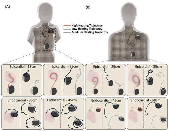 This work has several limitations. First, only a few epicardial and endocardial lead models were investigated. We are aware that other lead models exist in the market. Even within device models in our study, we limited our work to lead lengths that were most commonly used at our institution. For example, Medtronic 4965 epicardial leads also come in 50 cm length, and Medtronic 5076 endocardial leads also come in 52 cm, 65 cm and 85 cm lengths. Bipolar epicardial leads (e.g., Medtronic 4968 CapSure Epi (Minneapolice, MN, USA)) for biventricular or dual-chamber pacing were not investigated either. This was a compromise that allowed us to study each lead more thoroughly (i.e., more patient-derived trajectories) which we deemed to be crucial to infer conclusions on safety.