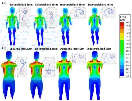 Simulated incident E field in (A) homogeneous child and (B) adult body models. Note that the incident field is the electric field of the MRI scanner in the absence of any implant. Trajectories of endocardial and epicardial devices are overlaid on the field maps for comparison. Details of simulation setting are provided in the Supplementary Information Figure S2 and Table S2.