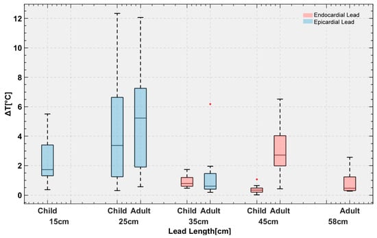 The second factor is attributable to differences in lead trajectories related to children’s anatomy. Because the IPG is much closer to the heart in pediatric patients compared with adults, there will be more excess lead length, which is usually looped around the IPG. The addition of these loops could have contributed to the lower RF heating similar to what is observed in neuromodulation devices [38,39]. This can be specifically appreciated comparing RF heating of the 45 cm endocardial leads in adult (3.2 ± 1.9 °C) vs. child (0.4 ± 0.3 °C) phantoms, where the difference in RF heating can be solely attributed to differences in position and trajectory of the lead (Figure 5). Individual temperature rise for each case is provided in the Supplementary Information Figure S3.