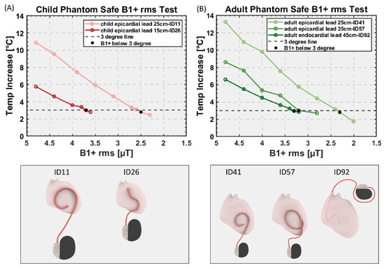 RMS B1+ values and their corresponding RF heating for device configurations that generated highest heating in each category for (A) child and (B) adult phantom. Black dots: RMS B1+ value that generates the temperature rise below 3 °C.