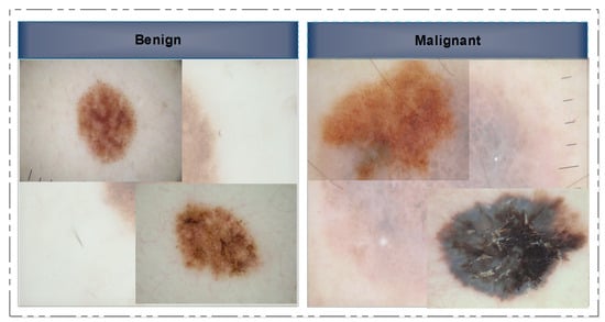 In this section, we provide a concise literature assessment of work done on skin lesion classification using CNNs. In a few cases, the classification frameworks were applied directly to the provided image samples, while in others, the images were initially pre-processed before being subjected to the main processing steps. We begin with a discussion of non-traditional or deep-model approaches to image classification. Several researchers have approached this issue by considering it as a binary classification problem, where the images are categorized into two primary classes: malignant and benign. Several image samples are presented to the readers as references in Figure 2. However, a small number of researchers even employed seven classes.