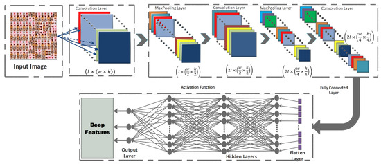 CNNs are the most spectacular versions of deep feedforward neural networks used for feature detecting and classifying [16,45]. Each neuron in a CNN is linked to a group of other neurons in the higher layer, using a feedforward technique. Convolution, pooling, and fully linked layers make up the three main sub-blocks of a CNN’s fundamental architecture, as depicted in Figure 3.