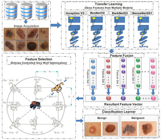 Melanoma is widely recognized as one of the most lethal forms of skin cancer, with its incidence showing an upward trend in recent years. Nonetheless, the timely detection of this malignancy substantially enhances the likelihood of patients’ long-term survival. Several computer-based methods have recently been proposed, in the pursuit of diagnosing skin lesions at their early stages. Despite achieving some level of success, there still remains a margin of error that the machine learning community considers to be an unresolved research challenge. The primary objective of this study was to maximize the input feature information by combining multiple deep models in the first phase, and then to avoid noisy and redundant information by downsampling the feature set, using a novel evolutionary feature selection technique, in the second phase. By maintaining the integrity of the original feature space, the proposed idea generated highly discriminant feature information. Recent deep models, including Darknet53, DenseNet201, InceptionV3, and InceptionResNetV2, were employed in our study, for the purpose of feature extraction. Additionally, transfer learning was leveraged, to enhance the performance of our approach. In the subsequent phase, the extracted feature information from the chosen pre-existing models was combined, with the aim of preserving maximum information, prior to undergoing the process of feature selection, using a novel entropy-controlled gray wolf optimization (ECGWO) algorithm. The integration of fusion and selection techniques was employed, initially to incorporate the feature vector with a high level of information and, subsequently, to eliminate redundant and irrelevant feature information. The effectiveness of our concept is supported by an assessment conducted on three benchmark dermoscopic datasets: PH2, ISIC-MSK, and ISIC-UDA. In order to validate the proposed methodology, a comprehensive evaluation was conducted, including a rigorous comparison to established techniques in the field.