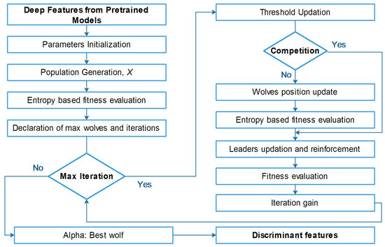 As mentioned above, we utilized GWO to solve the continuous optimization problem, but in the case of feature selection, we extended the work of [48] and embedded the concept of the entropy fitness function. A detailed flow of the proposed entropy-controlled gray wolf optimization algorithm is given in Figure 5.