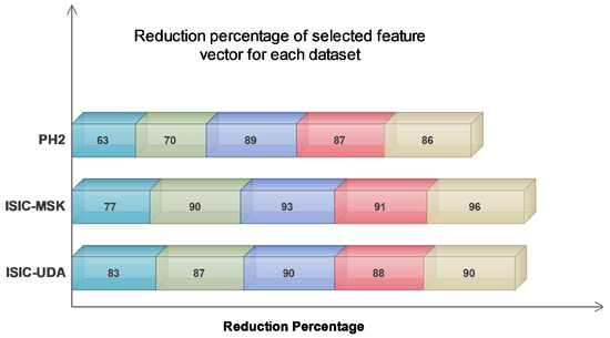 The findings presented in Table 4 demonstrate that the greatest reduction percentage was observed when all the extracted feature vectors (FV1–FV2–FV3–FV4) were combined. This suggests a high likelihood of redundant information. Despite the extent of the reduction achieved, the classification accuracy remained satisfactory. The average reduction percentage for the last feature combination, which included all feature vectors, was at its maximum value of 91.33%. By contrast, the average reduction percentages for the remaining feature combinations were 74.33%, 82.33%, 90.66%, and 88.66%, respectively. Additionally, an alternative manifestation of the impact can be observed in Figure 6, which illustrates that the greatest level of reduction was attained on the ISIC-MSK dataset. Based on the obtained results, we strongly believe that our proposed algorithm exhibits superior performance in handling large feature vectors, primarily due to its notable capability of effectively detecting and eliminating redundant information.
