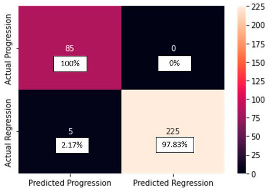 “Progression” class: Precision = 0.94, Recall = 1.00, F1-score = 0.97, Accuracy = 0.98.