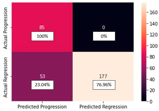 “Progression” class: Precision = 0.62, Recall = 1.00, F1-score = 0.76, Accuracy = 0.83.