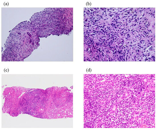 Through pathological analysis, IPT has been classified into two types: fibrohistiocytic (Figure 1a,b) and lymphoplasmacytic (Figure 1c,d). Fibrohistiocytic IPTs are featured by xanthogranuloma, multinucleated giant cells, and neutrophilic inflammation, observed most commonly in the peripheral hepatic parenchyma as tumor-forming nodules [6]. According to previous papers on hepatic IPTs, the lymphoplasmacytic type appears to refer to what we call plasma cell granulation tissue [4,21]. Additionally, it was shown that the two types of hepatic IPT had other clinical and pathological characteristics, such as immunohistochemical findings, clinical features, and the place of the nodules, implying the correctness of this classification theory.