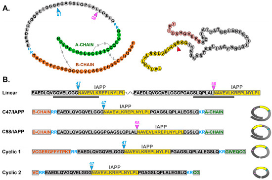 Figure 1 shows the full-length proinsulin and pro-IAPP sequences, including the IAPP insertion sites within proinsulin (left) and cleavage site for the IAPP peptide (right) (Figure 1A). Schematics of all probe constructs are shown in detail in Figure 1B.