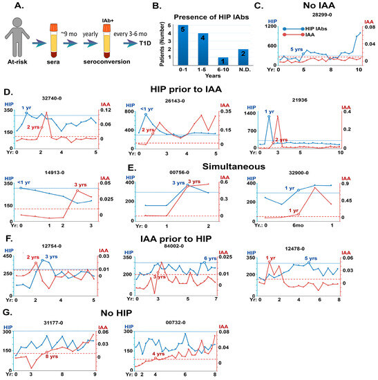 Longitudinal sera samples from 12 DAISY patients were then analyzed for the time of emergence of both HIP and insulin autoantibodies (Figure 4C–G). The results showed that sera from five patients contained HIP IAbs in the absence of (Figure 4C) or before insulin IAbs (Figure 4D), most commonly within the first year of study. In other patients, anti-HIP antibodies were detected simultaneously with or after anti-insulin IAbs (Figure 4E,F). Only 2 out of 12 patients appeared to have no significant anti-HIP IAb levels (Figure 4G). These studies confirm the presence of anti-HIP IAbs before disease onset and indicate that such IAbs may be valuable biomarkers for early prognosis.