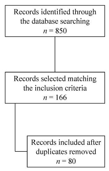 The database search found 850 articles. Based on their titles and abstracts, 166 articles met the inclusion criteria. After removing duplicates, 80 articles were analyzed for this review (Figure 1).