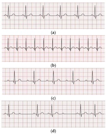 Heart disease (HD) is a lethal condition affecting a large number of human beings around the globe when compared to other diseases. According to the World Health Organization (WHO), HD is the leading cause of death globally, and it is estimated that HD is responsible for 17.9 million deaths per year [1]. Numerous conditions can lead to HD, including excessive hypertension, uncontrolled angina, cardiac arrhythmias, heart attacks, and so on. Therefore, early and timely arrhythmia detection and classification are crucial. This study focused on the automatic detection and classification of arrhythmias. A cardiac arrhythmia occurs when electrical impulses in the heart do not work correctly, resulting in irregular heartbeats. Heartbeats can be categorized into the following four kinds: (i): normal rhythm where the heart functions properly and the heartbeat rate is about 60−100 bpm; (ii): tachycardia occurs when the heart beats too quickly (more than 100 bpm); (iii): bradycardia happens when the ordinary person’s heartbeats become slower than average (less than 60 bpm) [2]; and (iv): heart rhythm irregularity (as seen in Figure 1a–d, respectively).