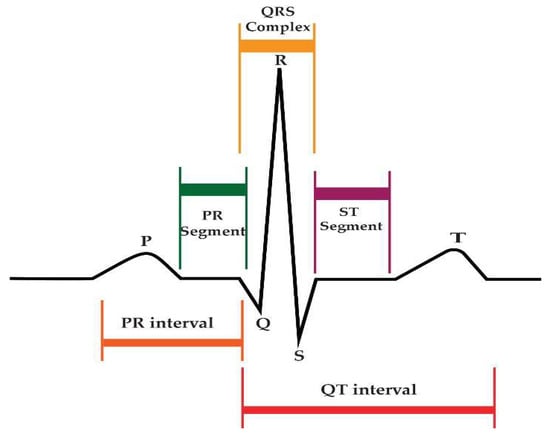 Arrhythmias can be diagnosed with the help of an electrocardiogram (ECG). The ECG is a well-established tool in cardiology for monitoring a patient’s heart condition. The 12-lead ECG is the most effective equipment for recording cardiac rhythm. The leads are the recording channels, and they are lead I, lead II, lead III, aVR, aVL, aVF, V1, V2, V3, V4, V5, and V6. Every channel records from a distinct perspective. Every normal ECG heartbeat has three main waves, namely the P-wave, T-wave, and R-point, as shown in Figure 2.