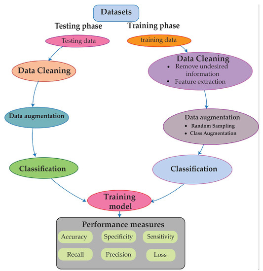 After separating the data, cleaning techniques were used to remove and eliminate unwanted data from the original dataset (such as duplicates, nulls, and additional information). Subsequently, to combat overfitting issues, this study used data augmentation techniques. Moreover, different techniques such as random sampling, class augmentation, and normalization were used throughout the data augmentation process. Then, a process known as min–max normalization was carried out, which rescaled the values to fall somewhere between 0 and 1. The following is the normalization formula: