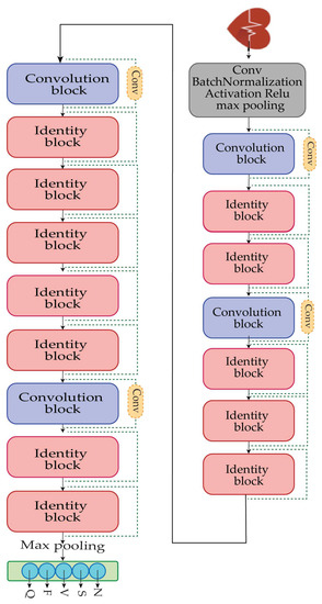 The fundamental purpose of this study is to provide a solution for the detection and classification of heart arrhythmia disease. The dataset that is used in this study is extremely unbalanced, as shown in Table 2. For the detection and classification of heart arrhythmia disease, the Reseek-Arrhythmia model is proposed, which consists of four convolutional blocks and twelve identity blocks, along with the convolution layer, normalization layer, activation function layer, and max pooling layer, as shown in Figure 4. ResNet50 was used as the foundational framework in this study, which is a well-known deep neural network design noted for its ability to train deep networks well by tackling the vanishing gradient problem with residual blocks. Each of the convolutional blocks and identity blocks will be discussed in the Section 3.4.