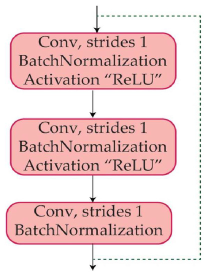 An identity block is a sort of residual block that enables a neural network to bypass specific layers. The input to an identity block is appended straight to the output of the block, allowing the network to “skip over” the block if further processing of the input is not required. An identity block is made up of a series of convolutional layers, followed by batch normalization and activation layers, and finally the addition of the input and output tensors. The identity block is intended to help prevent the problems of vanishing and gradients that can arise while training deep neural networks. It enables the network to learn more efficiently by allowing direct information flow via a shortcut connection between them. The identity block improves the flow of information from one layer to the next by keeping the input and output tensors in the same dimension, where each of the identity blocks consists of multiple layers such as convolution, batch normalization, and activation layers, as can be observed in Figure 6.