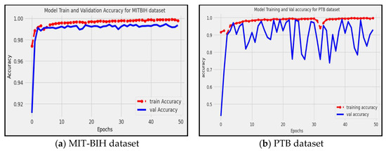 Figure 7 shows that the proposed model achieved approximately 0.9935 and 0.9350 accuracy on the MIT-BIH and PTB datasets, respectively. This indicates that the proposed model correctly predicted approximately 99.35% of the instances in the dataset, considering both true positive (TP) and true negative (TN) predictions. The red line represents the accuracy of the training data, while the blue line represents the accuracy of the validation data. Accuracy provides an overall measure of how well the model performs in classifying instances correctly, and it has been proven that the proposed model is able to successfully identify and classify arrhythmia patterns with a high level of accuracy.