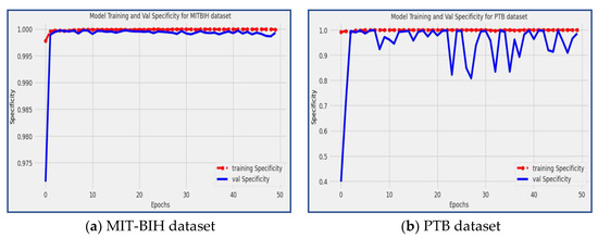 The model training and validation specificity for the MIT-BIH and PTB datasets.