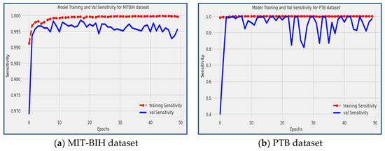 The proposed model demonstrated remarkable sensitivity scores on both the MIT-BIH and PTB datasets, achieving 98.59% and 99.55%, respectively. Figure 9 visually represents the performance of the model during the training and validation phases. The red line in the figure represents the sensitivity scores during model training, while the blue line corresponds to the sensitivity scores during validation. Sensitivity measures the model’s ability to correctly identify true positive (TP) instances, indicating its effectiveness in detecting and classifying arrhythmic patterns. The high sensitivity scores attained by the model indicate its strong ability to accurately identify instances of arrhythmias, making it a valuable tool for the early detection and classification of cardiac arrhythmia disease.