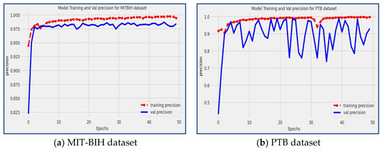 Precision is a crucial metric that provides valuable insights into the model’s accuracy in identifying specific types of arrhythmias. A high precision score, close to 1, indicates that the model has a low rate of false positive predictions, meaning that it accurately classifies positive instances with a high level of precision. A low accuracy score closer to 0 indicates that the model has a larger rate of false positives, which indicates a less accurate categorization for positive cases. The proposed model achieved precision of 98.39% and 92.97% on the MIT-BIH and PTB datasets, respectively, as shown in Figure 10. The precision scores reflect the model’s ability to accurately detect and classify particular types of arrhythmias, making it an accurate tool for the precise identification and categorization of cardiac arrhythmia conditions.