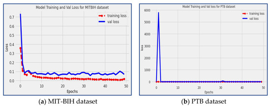 In our proposed model, we achieved a loss of 0.688 on the MIT-BIH dataset and 0.2564 on the PTB dataset, as depicted in Figure 12. The red line in the figure represents the training loss, while the blue line represents the validation loss.