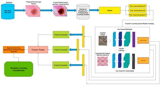 The proposed methodology is illustrated in Figure 2. Figure 2 reflects that firstly, the dataset is preprocessed, and then the enhanced dataset is fed to fine-tune the DL model for training based on transfer learning to extract deep features. Secondly, the extracted features are passed through the feature fusion process. Finally, an updated Antlion optimization approach was employed to obtain an optimized feature vector.