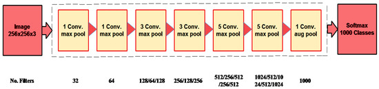 Fine-Tuned DarkNet19: The model is fine-tuned by eliminating linked, softmax, classification, and final four average-pool layers. The original model is shown in Figure 5. It is all because it is pre-trained on 1000 classes belonging to the ImageNet dataset. Hence, during the fine-tuning process, four new layers are added, including the average-pooling 2D-layer, fully connected layer, softmax layer, and classification layer. The Darknet19 model is trained through transfer learning. In the training process, several hyper-parameters are adjusted, i.e., the learning rate is 0.001, the minimum-batch size is 20, the momentum is 0.07, the optimizer is stochastic gradient descent, and the maximum epochs are 100. Finally, the trained model extracts features adopting the gap layer.