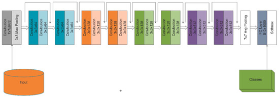 Fine-Tuned ResNet18: The ResNet18 DL model consists of 18 layers. The architecture has a fully connected combination of softmax, convolutional, pooling, and classification layers. This model uses a pooling layer named ‘pool5’ for feature extraction. From the ImageNet dataset, more than a million images will be trained on the network when you load the pre-trained version. The architecture of ResNet18 is depicted in Figure 6. The last four layers, termed the average—layer, are deleted during the fine-tuning phase, along with the fully connected, softmax, and classification layers. The previous fully connected layer was trained on an ImageNet dataset with 1000 item types.