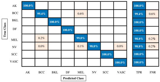 Classification results of proposed optimization algorithm on augmented ISIC2019 skin dataset.