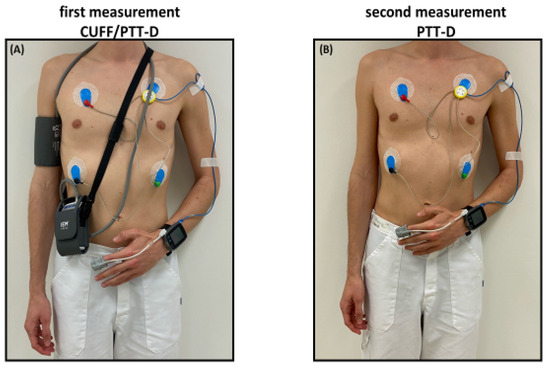 Study Flow: (A) first measurement with the cuffless device on the left arm and the reference device on the right arm (CUFF/PTT-D); (B) second measurement with only the cuffless device (PTT-D).