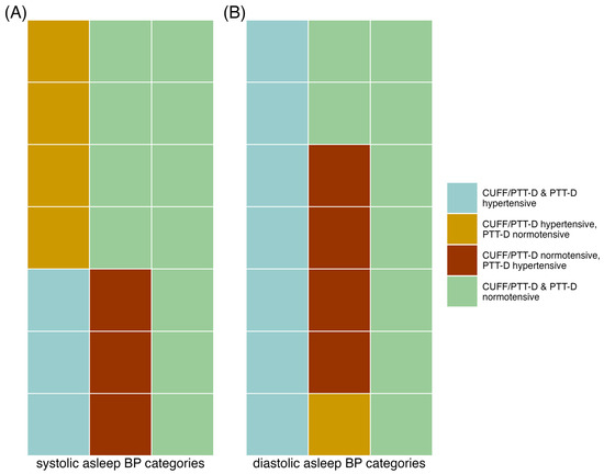 Tile graphs showing the various hypertensive classifications of patients according to each device; each tile represents one individual patient. (A) mean systolic asleep hypertensive classification; (B) mean diastolic asleep hypertensive classification.