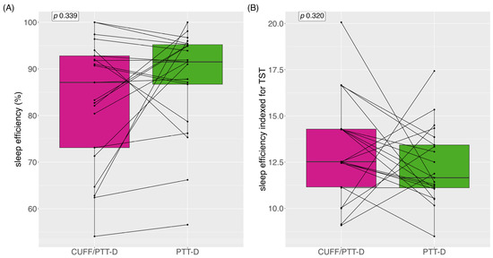 Median (IQR) sleep efficiency indexed during the total sleep time (TST) (in hours) was 12.5% (3.2) and 11.7% (2.6) for CUFF/PTT-D and PTT-D, respectively (p = 0.320) (Figure 5B).