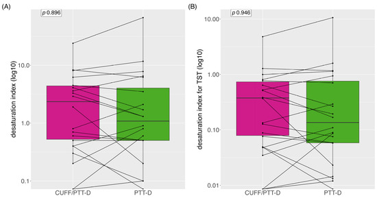 Desaturations depicted as boxplots as median desaturation; (A) desaturation with CUFF/PTT-D and PTT-D; (B) desaturation with CUFF/PTT-D and PTT-D indexed for total sleep time. Data are shown as medians (log) and interquartile range, with each line representing one individual patient.