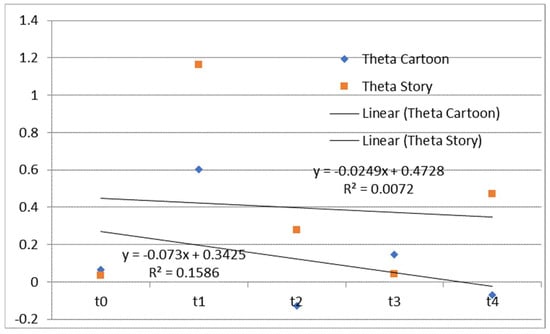 The time dependence of differences between the mean spectral power of the left and right hemispheres in the theta frequency range during watching and listening to a cartoon and listening to a story. Theta Cartoon—differences between the mean spectral power of the left and right hemispheres in the theta frequency range during watching and listening to a cartoon; Theta Story—differences between the mean spectral power of the left and right hemispheres in the theta frequency range during listening to a story; Linear (Theta Cartoon)—linear approximations of Theta Cartoon; Linear (Theta Story)—linear approximations of Theta Story.