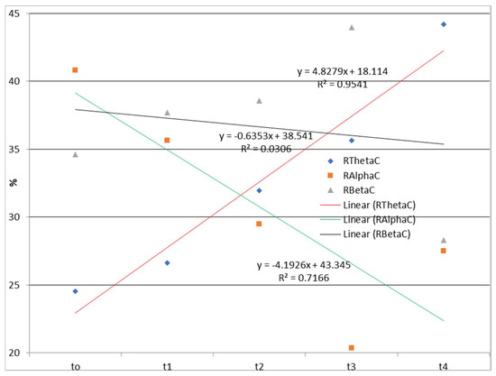 Time dependences of the relative ratios of theta, alpha, and beta rhythms calculated according to Equation (1) during watching and listening to a cartoon. RThetaC—the relative contribution of the theta frequency range to the total signal during watching and listening to a cartoon; RAlphaC—the relative contribution of the alpha frequency range to the total signal during watching and listening to a cartoon; RBetaC—the relative contribution of the beta frequency range to the total signal during watching and listening to a cartoon; Linear (RThetaC)—linear approximations of RThetaC; Linear (RAlphaC)—linear approximations of RAlphaC; Linear (RBetaC)—linear approximations of RBetaC.